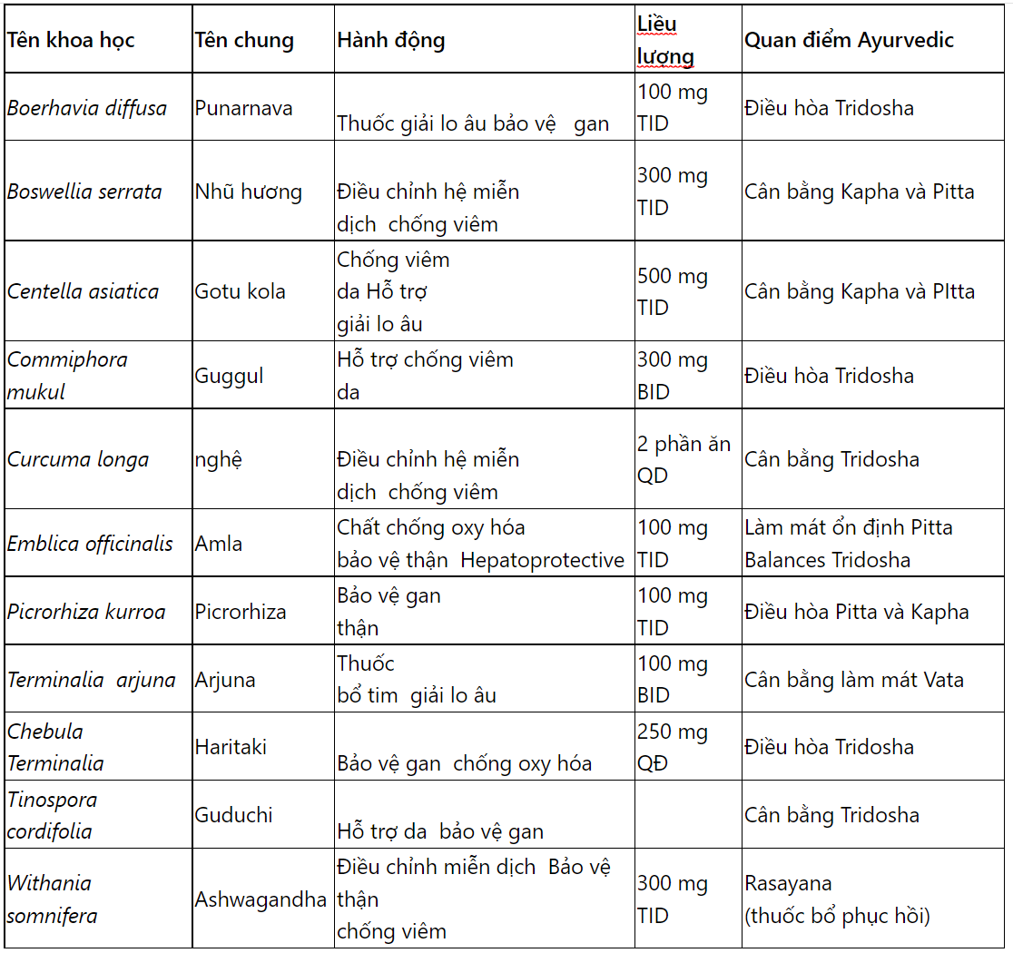Trong trường hợp của bệnh nhân này, các khuyến nghị về chế độ ăn uống đã được đưa ra, bao gồm loại bỏ gluten và tuân thủ chế độ ăn chay chủ yếu bao gồm không ít hơn 7 phần rau và 3 phần trái cây mỗi ngày. Một lượng nhỏ cá nước lạnh cũng được phép. Ngoài ra, một số loại thảo mộc đã được sử dụng, được liệt kê trong Bảng 1 với giải thích đơn giản về việc sử dụng chúng. Các nguyên tắc điều trị tổng thể bao gồm hỗ trợ tập trung cho gan và thận, điều chỉnh hệ thống miễn dịch, làm mát cơ thể (khi cô ấy bị viêm khắp cơ thể) và chữa lành da, vì đây là phàn nàn chính của bệnh nhân.