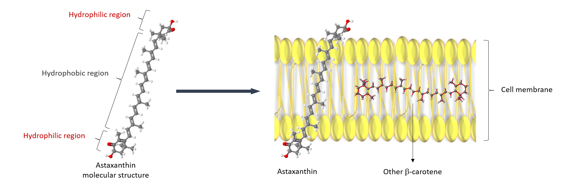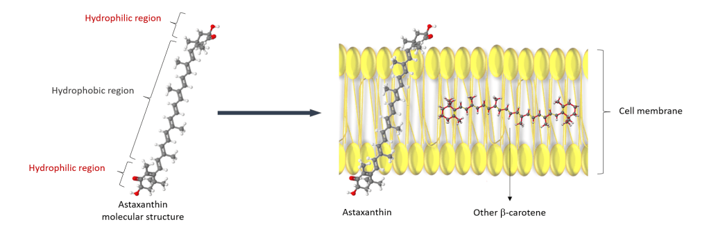 - Astaxanthin vừa tan trong nước và tan trong chất béo. Điều này có nghĩa là nó có thể bảo vệ toàn bộ tế bào – cả lớp bên trong và bên ngoài của màng tế bào – không giống như các carotenoid khác, chỉ có thể bảo vệ phần hòa tan trong nước hoặc phần hòa tan trong chất béo của tế bào.